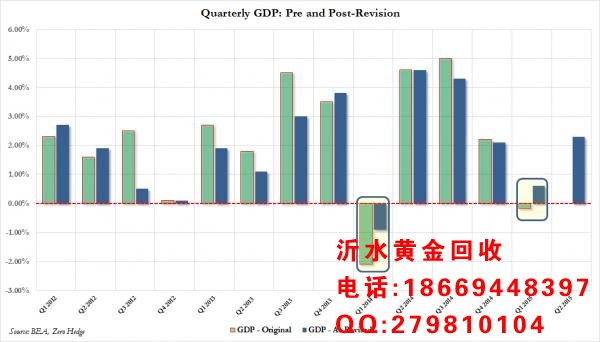 美国商务部(DOC)公布的数据显示,美国二季度GDP初值年化季率增长2.3%,略微不及市场预期的增长2.6%。但同时,商务部将一季度GDP上修为增长0.6%,前值萎缩0.2%。